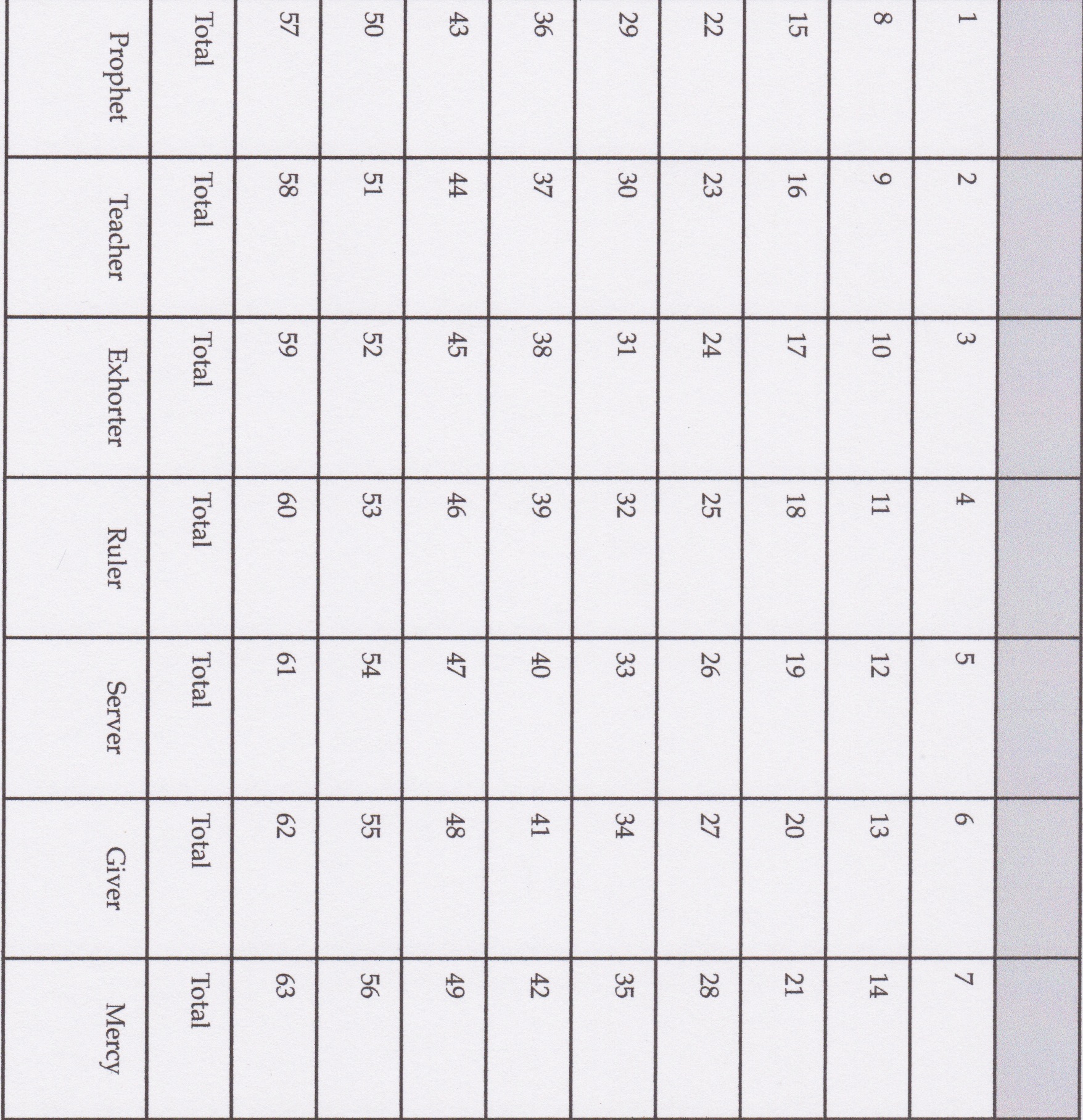 Using the chart below or making one similar, fill in the corresponding number as your child answers the spiritual gift questions to the best of their understanding. I surveyed my children between the ages of 8 and 10 and then did again when they were older. Usually (5), Sometimes (3), Seldom (1), Almost Never (0). When you are done, add up each column, the highest numbers are their gift ‘bent’. Below the chart, click on each ‘gift’ to learn more its characteristics.