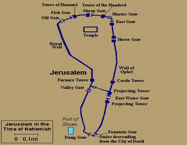 It is important to note that the boundaries of city of Jerusalem in the days of Nehemiah were very different, and much smaller, from modern times. Some gates had different names; other gates didn’t exist or exist now. The layout of the city went south into the City of David or Mount Zion rather than west towards what is known today as the Old City. Excavations of the Broad Wall are found near the center of the Jewish Quarter near the Hurva Synagogue.